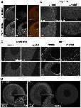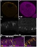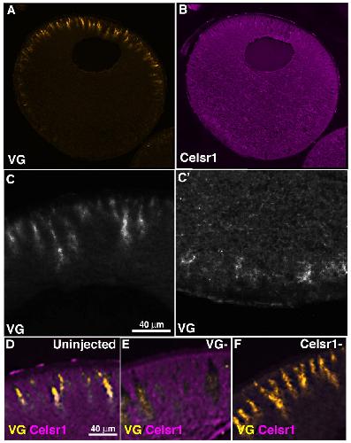 Fig. 1. Vangl2 and Celsr1 distribution in wild-type, full grown (stage 6) Xenopus oocytes. (A,B) Histological sections of stage 6 oocytes showing immunostaining pattern for Vangl2 (VG) protein (A) and Celsr1 protein (B). (C,Câ²), Higher magnification of animal (C) and vegetal (C') hemisphere distribution of Vangl2 protein. (D-F), Images of animal hemisphere sections co-immunostained for Vangl2 and Celsr1 in uninjected control sibling (D), Vangl2-depleted (VGâ; E) and Celsr1-depleted (Celsr1â; F) stage 6 oocytes.