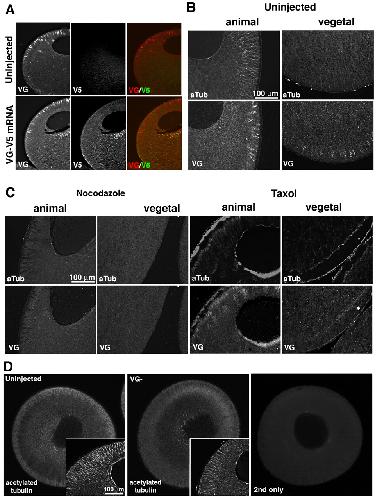 Fig. 2. Vangl2 protein distributes with and maintains the acetylated microtubule cytoskeleton. (A) Co-immunostaining of sections from uninjected and Vangl2-V5 mRNA (20 pg)-injected stage 6 Xenopus oocytes using Vangl2 (VG) and V5 tag (V5) antibodies. (B) Co-immunostaining of sections of wild-type stage 6 oocytes for acetylated tubulin (aTub) and Vangl2 (VG) in the animal and vegetal hemispheres. (C) Co-immunostaining for acetylated tubulin and Vangl2 protein in sections of nocodazole-treated (5 μg/ml) and taxol-treated (2 μM/ml) stage 6 oocytes. (D) Optical sections (2.6 μm thickness) of stage 6 control and Vangl2-depleted (VGâ) oocytes stained as whole mounts to show the acetylated tubulin cytoskeleton. Insets show higher magnification images of histological sections stained with the same antibody. Right-hand panel shows a control whole mount stained with secondary antibody only.