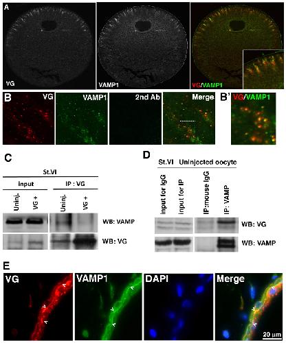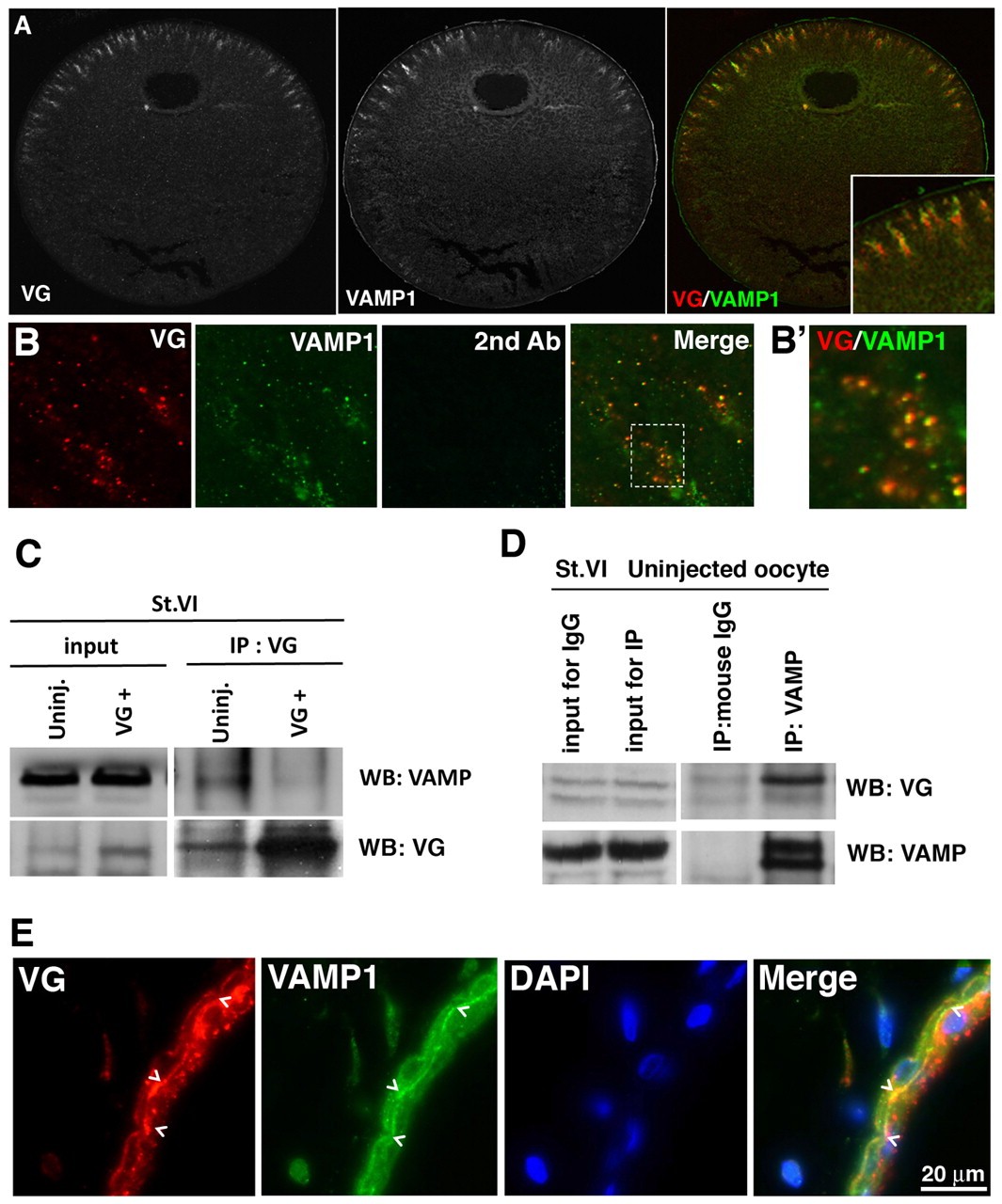 Fig. 3. Vangl2 interacts with VAMP1. (A) Histological section of a stage 6 Xenopus oocyte co-immunostained for Vangl2 (VG) and VAMP1. (B,Bâ²) Colocalization of Vangl2 (red) and VAMP1 (green) in the stage 6 oocytecytoplasm. Bâ² shows a high magnification image (Ã100 oil objective with digital zoom) of the boxed area in B demonstrating the co-distribution of Vangl2 and VAMP1 (yellow). (C) Co-immunoprecipitation analysis of lysates from wild-type and Vangl2 mRNA (VG+; 500 pg)-injected stage 6 (St. VI) oocytes showing that endogenous Vangl2 protein (VG) interacts with endogenous VAMP1 protein (VAMP). Overexpressed Vangl2 reduces the total Vangl2 interaction with VAMP1. The expression level of VAMP1 in these samples is shown in the input lanes. (D) Co-immunoprecipitation analysis of an uninjected oocyte showing that endogenous VAMP1 protein interacts with endogenous Vangl2 protein. Mouse IgG serves as a negative control for non-specific binding of Xenopus oocyte lysates to the bead. (E) Co-immunostaining for Vangl2 (VG) and VAMP1 protein in histological sections of stage 45 tadpoleskin. DAPI staining shows nuclei in the bilayered epidermis. Colocalization of VG and VAMP1 is most obvious on the basal side of the outer layer of the epithelium (chevrons, yellow staining in merge).