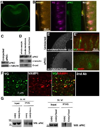 Fig. 5. aPKC regulates the distribution of the acetylated microtubule cytoskeleton and Vangl2-VAMP1 islands. (A) Histological section of a follicle-free (collagenase-treated) stage 6 Xenopus oocyte stained for aPKC protein. The nuclear staining is non-specific, as it is also observed in aPKC-depleted oocytes (not shown). (B) High magnification images of a histological section of the animal cortex of a control stage 6 oocyte co-immunostained for VAMP1, Vangl2 (VG) and aPKC. Chevron indicates a follicle cell. (C) Western blot showing aPKC protein levels in control and aPKC antisense oligonucleotide-injected (aPKCâ) oocytes. (D) Western blot for aPKC using lysates from membrane and cytosolic fractions. Total α-tubulin is used as a marker for the cytosolic fraction and C-cadherin (C-cad) is used as a membrane fraction marker. (E,Eâ²) Sections of control (upper panels) and aPKC-depleted (lower panels) stage 6 oocytes immunostained for acetylated tubulin (E) and Vangl2 (green) and VAMP1 (red) (Eâ²). (F) Colocalization of Vangl2 (green) and VAMP1(red) proteins in aPKC-depleted oocytecytoplasm. Right-hand panel shows incubation with secondary antibody only. (G) Co-immunoprecipitation analyses of lysates of control stage 6 (St. VI) oocytes showing that endogenous Vangl2 protein interacts with aPKC and that this interaction is not reduced by nocodazole (Noco) treatment (5 μg/ml) but is reduced by taxol treatment (2 μM/ml).