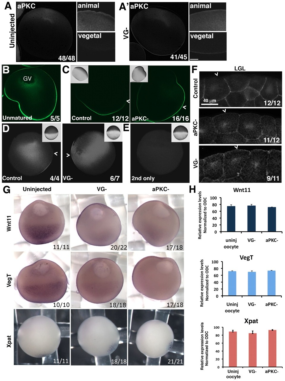 Fig. 6. Vangl2 and aPKC are required for specific oocyte membrane and mRNA asymmetries. (A,Aâ²) Low and high magnification images of hemisected whole-mount, progesterone-matured control (A) and Vangl2 depleted (VGâ; Aâ²) Xenopus oocytes stained for endogenous aPKC. (B,C) Localization of overexpressed GFP-LGL protein in anti-GFP immunostained histological sections of a stage 6 control oocyte (B) and progesterone-matured control and aPKC-depleted (PKCâ) oocytes injected with GFP-LGL mRNA (C). Insets show bright-field images. Chevrons indicate the boundary between the animal and the vegetal hemispheres. (D) Comparison of the staining pattern of GFP-LGL in whole-mount anti-GFP immunostained control and Vangl2-depleted (VGâ) progesterone-matured oocytes. Insets show the brightfield appearance of each oocyte and chevrons indicate the junction between animal and vegetal hemispheres. (E) Control for experiment shown in D showing a progesterone-matured oocyte that did not receive GFP-LGL mRNA injection. (F) GFP-LGL protein localization in histological sections of control, aPKC-depleted (aPKCâ) and Vangl2-depleted (VGâ) animal cells of embryos at the blastula stage, injected with GFP-LGL mRNA at the 2-cell stage. Chevrons mark the apical membrane of superficial cells in the animal cap. (G) In situ hybridization of sibling control, Vangl2-depleted (VGâ) and aPKC-depleted (aPKCâ) stage 6 oocytes probed for Wnt11, VegT and Xpat mRNAs. (H) Relative expression levels of Wnt11, VegT and Xpat mRNAs in control (uninj oocyte), Vangl2-depleted (VGâ) and aPKC-depleted (aPKCâ) oocytes determined by real-time RT-PCR (mean±s.d.).