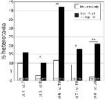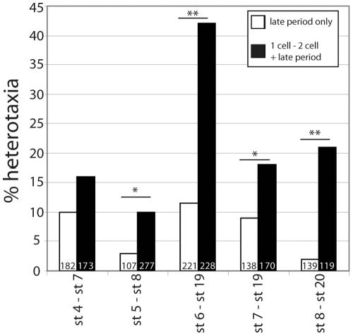 Figure 3. Vibration from 1 cell to 2 cell, paired with various later vibration periods, increases the rate of heterotaxia.One set of embryos was vibrated for a select period of time later in development (white bars). A second set was vibrated from 1 cell to 2 cell, allowed to rest in a vibration-free environment, and then re-vibrated for the same select period of time later in development (black bars). In all cases, adding vibrations from 1 cell to 2 cell increased the incidence of heterotaxia observed at st. 45. Vibrations from 1 cell to 2 cell without a later period of vibration were not significantly different from untreated controls (not shown here, see Figure 2). For statistical comparison, the actual numbers of embryos from two or more replicate studies with wildtype versus heterotaxic situs were compared for single late vibrations and the two paired vibrations (χ2 test, *p<0.05, **p<0.001). |