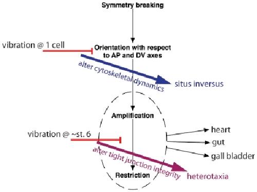 Figure 8. Vibrations affect patterning of the left-right (LR) axis in two distinct ways, producing different phenotypes depending on the timing of treatment.Early events involved in the patterning of the LR axis have been split into three basic steps [1], [42], [94]: breaking of symmetry, orientation of the axes, and amplification/restriction of LR signals. Targeting each of these steps is expected to produce different phenotypes: altered symmetry breaking leads to mirror-image left and right halves, i.e. isomerisms, a LR defect rarely if ever seen in Xenopus but often observed in mutant mice; altered orientation of the axes will produce a mixed population of wildtype and mirror-image individuals (with situs inversus) because the LR axis is randomly oriented with respect to the anterior-posterior and dorsal-ventral axes; altered amplification/restriction of LR signals will cause each organ to make independent decisions, thus producing a population of heterotaxic individuals. Here, we show that early vibrations produce large amounts of situs inversus, therefore we propose that the effects of early vibrations on the cytoskeleton are responsible for the second step, proper orientation of the three axes. The effects of vibrations during the second period of sensitivity largely produce heterotaxia, thus we propose that the effects of vibration on tight junction integrity, part of the ion flux pathway, alters the third step in the pathway, the amplification/restriction of LR signals. |