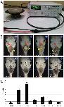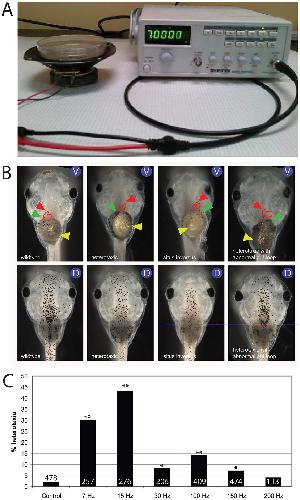 Figure 1. Heterotaxia is induced by various low frequency vibrations. A) A simple experimental device was produced from a Gwinstek GFG-8216A function generator (right) attached to a 4-inch Sony speaker (left). A petri dish, with the appropriate solution containing embryos, was placed on top of the speaker at various stages. B) Ventral views (V) showing organ position and dorsal views (D) showing normal dorsoanterior development in tadpoles with wildtype situs, heterotaxia, and situs inversus. In all panels of ventral views, the red arrowhead indicates the apex of the heart, yellow indicates the stomach, and green indicates the gall bladder. For wildtype organ situs, the apex of the heart loop is located on the animal's right side, the stomach coils to the animal's left, and the gall bladder is positioned on the animal's right. The heterotaxic tadpole shown here has an inverted heart, but normal position of the stomach and gall bladder. There are seven combinations of position of the three scored organs that are each examples of heterotaxia, including situs inversus, where all three organs are inverted. The right-most panel also shows an animal with heterotaxia, with an inverted stomach and gut, but normal position of the heart. Note that the coiling of the stomach is also abnormal, a phenotype observed in a minority of vibrated embryos (<5% at 7 Hz). C) Quantification of heterotaxia in embryos vibrated at different frequencies from 1 cell through st. 19 of development. 7 Hz and 15 Hz were the most effective at randomizing the LR axis, but 15 Hz vibration also produced other developmental abnormalities in a large subset of embryos (not shown); therefore, 7 Hz was selected for additional study. Numbers on bar graphs indicate sample sizes from a combination of two or more replicate studies. * p<0.01, but not biologically relevant because heterotaxia rates were below 10%, the minimal meaningful difference. ** p<0.001, Ï2 test. |