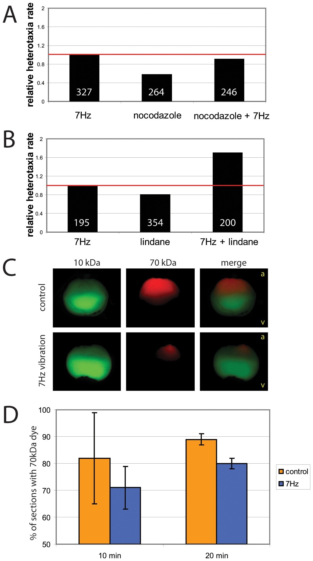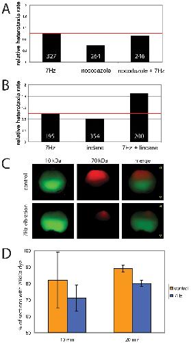 Figure 6. Epistasis and dye movement experiments indicate that low frequency vibrations alter nocodazole-sensitive pathways and intracellular movements. For epistasis experiments, embryos were vibrated, treated with a drug, or given a combination of these two treatments from 1 cell to st. 12, and organ laterality was assessed at st. 45. If the combination produced an additive effect, we concluded that these treatments were likely affecting different aspects of the left-right (LR) pathway; if the combination was not additive, we concluded that the treatments were likely targeting the same aspects of the LR pathway. A) Embryos were vibrated, treated with the microtubule disruptor nocodazole, or a combination of the two. No additive effects on heterotaxia rates were observed, therefore it is likely that vibrations target nocodazole-sensitive LR pathways. B) In contrast, embryos treated with lindane, a gap junction blocker, and vibration showed additive effects over each treatment alone. These results show that additive effects can be obtained, and indicate that vibrations are not likely to be targeting gap junctions. C) 1 cell embryos were injected in the central area of the animal pole with a mixture of two dyes, then vibrated or left untreated and examined 10 minutes later. In both treatments, the low molecular weight dye (10 kDa) spread throughout most of the embryo with the strongest concentration in the vegetal hemisphere. In controls, the high molecular weight dye (70 kDa) typically spread throughout the top third of the embryo, whereas the same dye remained localized much more strongly to a single point in the upper quadrant of animal pole in the vibrated embryo. Orientation of the embryos is indicated in the merged panels with a (animal) and v (vegetal). D) Sections were obtained from 1 cell embryos after 10 or 20 minutes of vibration, and time-matched unvibrated controls. The percentage of A/V sections containing TMR dye were calculated, giving a quantitative measure of how far the dye had spead laterally through the embryo. The data indicate that over time, the high molecular weight dye spread out laterally in control embryos, but in vibrated embryos, the dye spread to a lesser degree. |