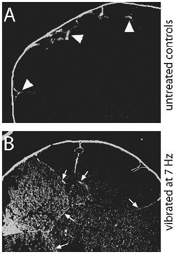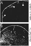 Figure 7. Epithelial integrity is disrupted in vibrated embryos. A) Using a biotin permeability assay, we determined that epithelial integrity was maintained in control embryos such that the biotin signal was normally observed at the outer edges of the embryo, less than 1 cell depth (arrowheads). B) In vibrated embryos, the biotin signal was observed much farther into the embryo, with signal several cell layers deep (arrows). |