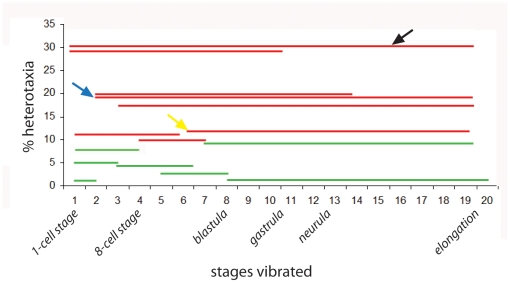 Figure 2. Vibration period influences the frequency of laterality defects.When embryos were vibrated at 7 Hz during different periods of development, striking differences in the rate of heterotaxia were observed. Most effective were vibrations that started at 1 cell and went through mid-gastrula (st. 10.5) or neurula stages (st. 19, see black arrow). Somewhat less effective were vibrations starting just a short time later, at the 2 cell stage (blue arrow). Finally, vibrations that included a second period of time, around st. 6, were able to disrupt left-right patterning, but to a lesser degree (see yellow arrow, for example). For all groups, a red line indicates significant differences from non-vibrated controls (χ2 test, p<0.01) and heterotaxia rates above the minimal meaningful difference of 10%. A green line indicates that the treatment either was not significantly different from controls or was below the minimal meaningful difference of 10% heterotaxia. All lines are the summed data from two or more replicate studies. |