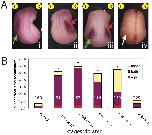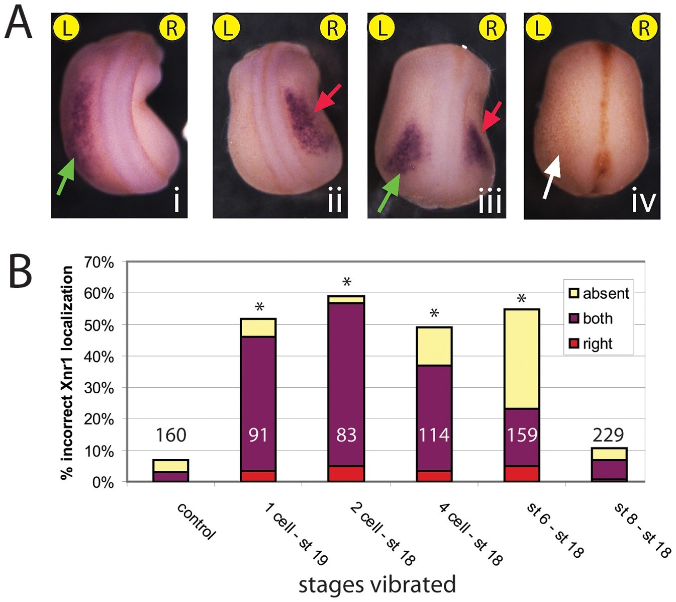 Figure 4. Localization of the asymmetric gene Xnr-1 is affected by vibration during early, but not late, cleavage stages. A) Control and vibrated embryos were examined at approximately st. 22 for the localization of Xnr-1 mRNA. All embryos were classified as having correct, left-sided expression (i), or incorrect right-sided (ii), bilateral (iii) or absent (iv) expression. Green arrows indicate correct expression, red indicate incorrect expression, and white indicate absent expression. All embryos are positioned with the anterior upward and the left (L) and right (R) sides are indicated. B) Quantification of incorrect Xnr-1 localization in control and vibrated embryos. When vibrations started at 1 cell, 2 cell, 4 cell or st. 6, there was a significant increase in incorrect Xnr-1 expression compared to controls (Ï2 test, *p<<0.001). Vibrations starting at st. 8 were not statistically different from untreated controls. |
