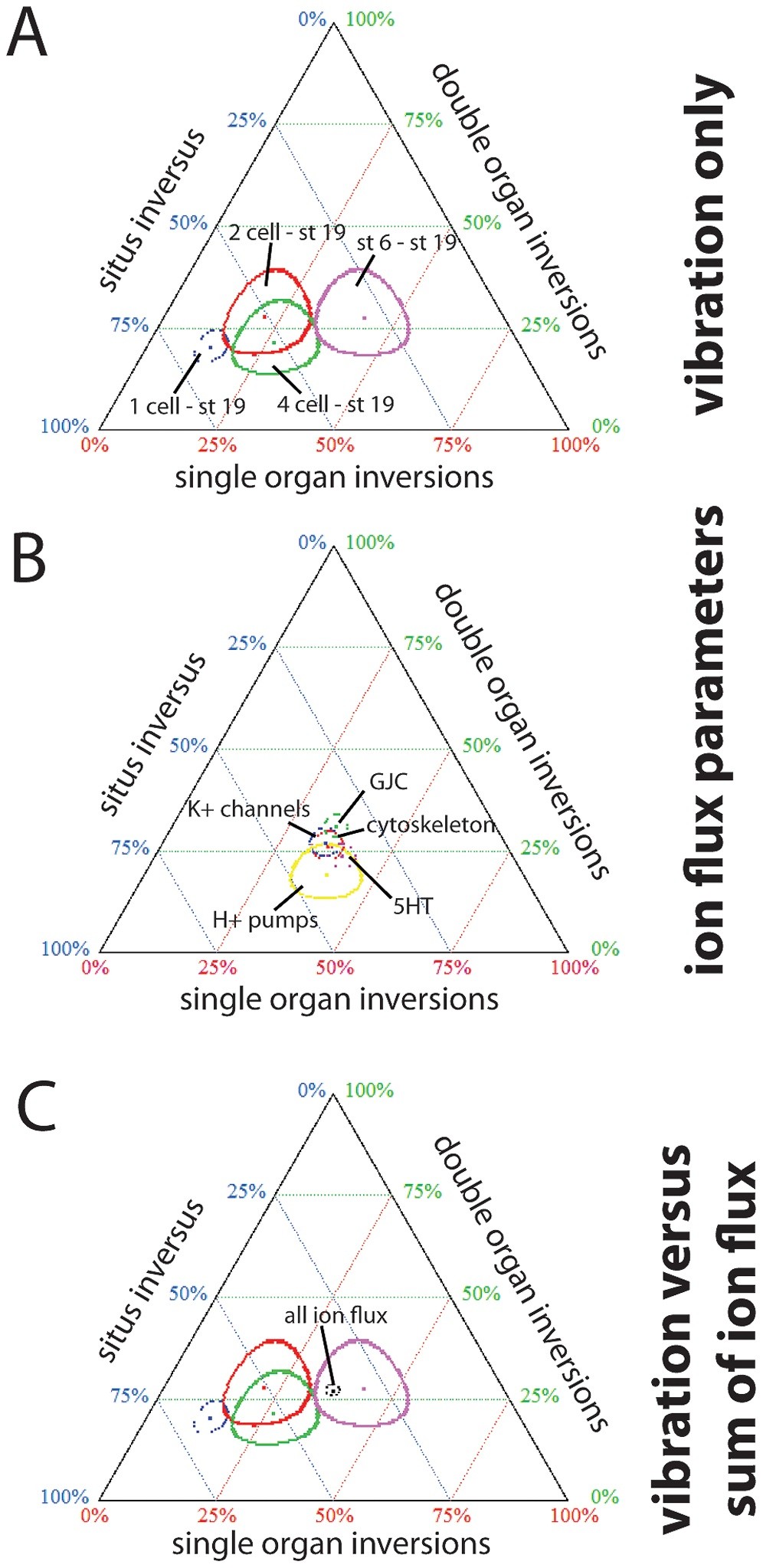 Figure 5. Ternary plots reveal unique signatures of inverted organs depending on the timing of vibration treatment. All heterotaxic embryos were compiled by treatment and graphed on a ternary plot where one axis represents the % of embryos with single organ inversions, the second axis represents the % of embryos with two (double) organ inversions, and the third axis represent the % of embryos with situs inversus (all three organs inverted.) Data is graphed so a single point represents each treatment, surrounded by an oval that illustrates the 95% confidence interval (CI); when the ovals do not overlap, the groups are significantly different from each other [67]. A) Unique signatures of embryos vibrated from 1 cell to st. 19 (blue), 2 cell to st. 19 (red), 4 cell to st. 19 (green) or st. 6 to st. 19 (violet) demonstrate that the period of vibration significantly affects the organ inversions observed. Most striking are the differences in the incidence of situs inversus, which is highest in embryos vibrated from 1 cell to st. 19 and lowest in embryos vibrated from st. 6 to st. 19. B) Signatures of affected organs are very similar in heterotaxic embryos from groups treated with chemicals and molecular constructs targeting H+ pumps (yellow), K+ channels (blue), gap junctional communication (GJC, green), the cytoskeleton (red), and the LR signaling molecule serotonin (5HT, purple). For a complete list of the reagents used, see Supplemental Table 2. C) The ion flux data shown in panel B was combined and statistically collapsed to produce a datapoint that represents all ion flux-related treatments (black dots, inside the violet circle). This was compared to the signatures obtained from the vibration protocols (panel A). The ion flux data thus overlaps with the signatures obtained from vibrations occurring from st. 6 through neurulation (violet). |