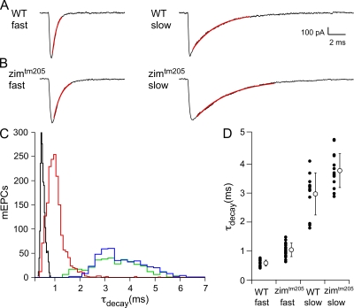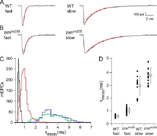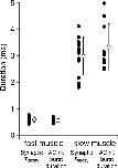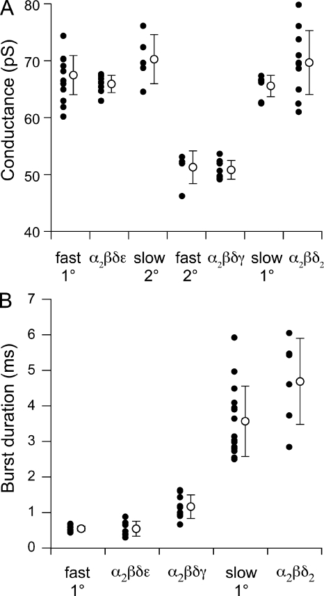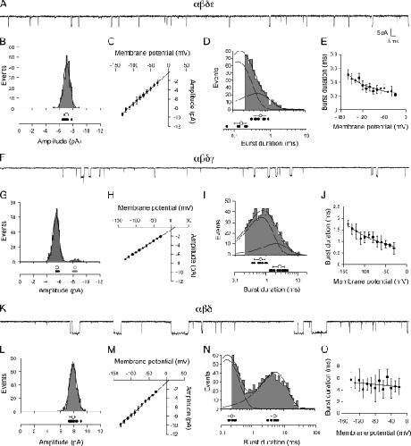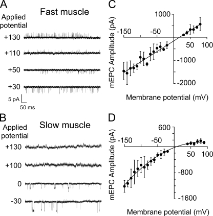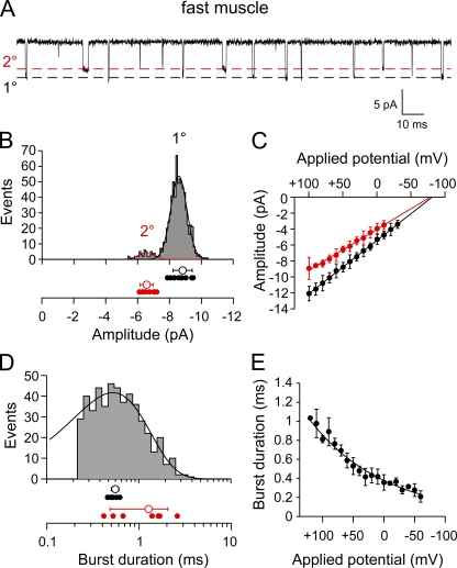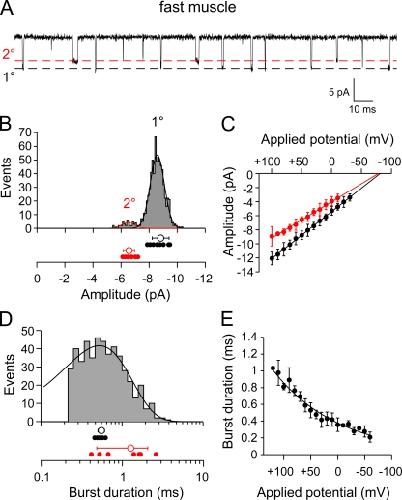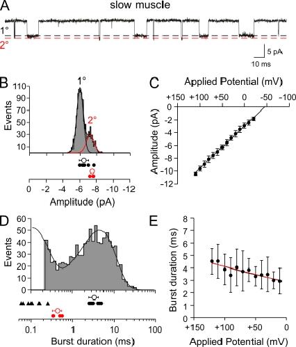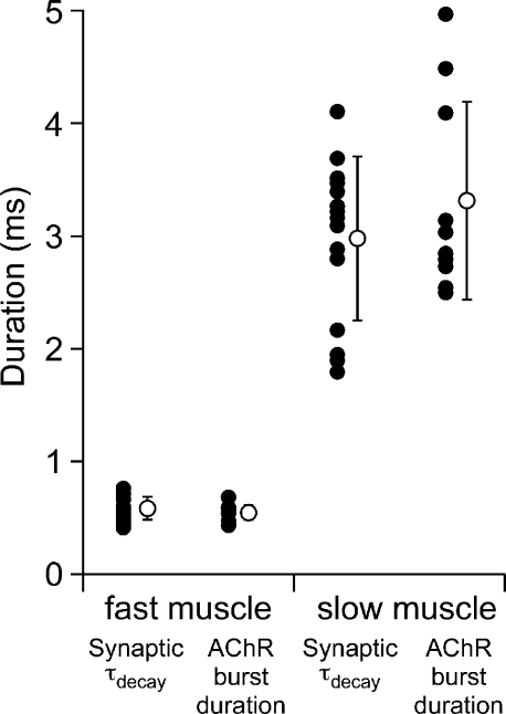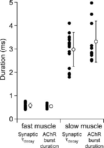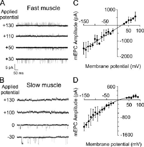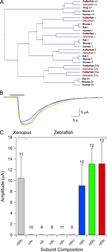 Fast and slow skeletal muscle types in larval zebrafish can be distinguished by a fivefold difference in the time course of their synaptic decay. Single-channel recordings indicate that this difference is conferred through kinetically distinct nicotinic acetylcholine receptor (AChR) isoforms. The underlying basis for this distinction was explored by cloning zebrafish muscle AChR subunit cDNAs and expressing them in Xenopus laevis oocytes. Measurements of single-channel conductance and mean open burst duration assigned α(2)βδε to fast muscle synaptic current. Contrary to expectations, receptors composed of only αβδ subunits (presumed to be α(2)βδ(2) receptors) recapitulated the kinetics and conductance of slow muscle single-channel currents. Additional evidence in support of γ/ε-less receptors as mediators of slow muscle synapses was reflected in the inward current rectification of heterologously expressed α(2)βδ(2) receptors, a property normally associated with neuronal-type nicotinic receptors. Similar rectification was reflected in both single-channel and synaptic currents in slow muscle, distinguishing them from fast muscle. The final evidence for α(2)βδ(2) receptors in slow muscle was provided by our ability to convert fast muscle synaptic currents to those of slow muscle by knocking down ε subunit expression in vivo. Thus, for the first time, muscle synaptic function can be ascribed to a receptor isoform that is composed of only three different subunits. The unique functional features offered by the α(2)βδ(2) receptor likely play a central role in mediating the persistent contractions characteristic to this muscle type.