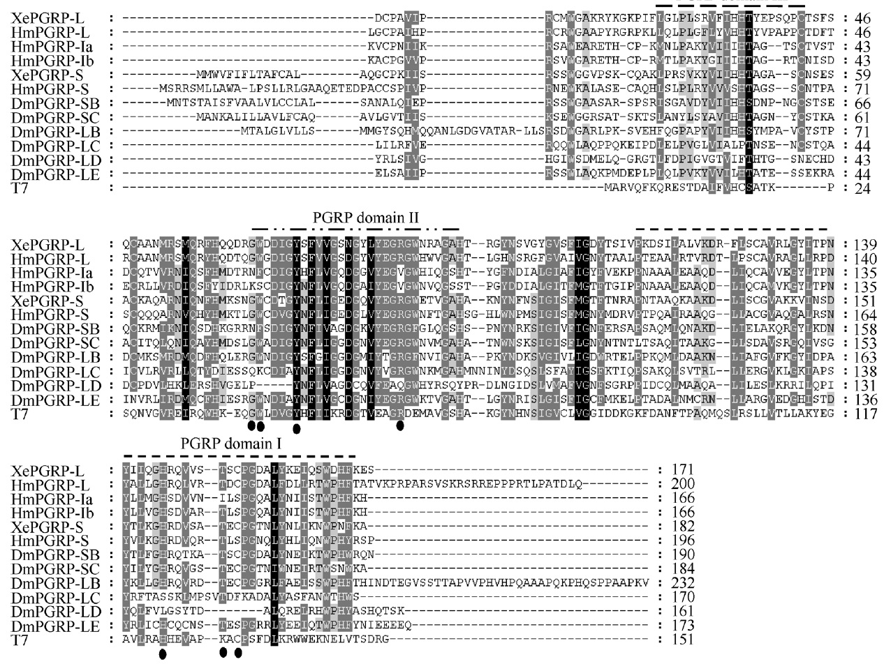 Fig. 2 Multiple alignment of XtPGRP-L with other PGRPs