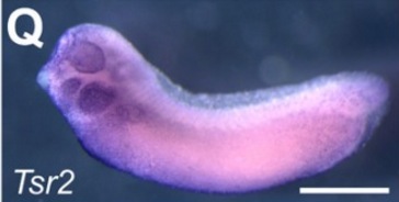 Figure 4. Expression of lens specific genes during development. In situ hybridisation of three Crystallin genes and Cugbp1b during development of the lens, indicated by dark blue staining. A-D, Cryaa expression at st. 26 (A), 30 (B) and 38 (C and D). E-H, Expression of Cryba1 throughout the lens at st. 26 (E), 30 (F) and 38 (G and H). I-L, expression of Crygb. I) at st. 26, note that red arrowhead indicates a transient stripe of expression in the hindbrain. Crygb is expressed in the central lens at st. 30 (J) and 38 (K and L). M-P) Cugbp1b transcripts are absent from the forming eye at st 26 (M), detected in the central lens cells at st.30 (N), and in the outer lens cells at st. 38 (O and P). Q) Tsr2 is expressed in epithelial cells including the cells overlying the eye, shown at stage 30. R) Prox1 expression is lens specific at stage 30, as previously described [23]. Sox2 is expressed throughout the eye as well as in the olfactory placode lateral line primordia and branchial arches as previously described [24]. White arrows indicate the position of the eye, scale bars in D, H, L, P, Q, R and S are 200 μm and red dots show the approximate margin of the eye. Scale bars in A, E, I and M apply to all other panels and correspond to 1 mm. Embryos are oriented with anterior to the left and dorsal uppermost. |
