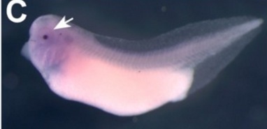 cryba1 (crystallin beta A1) gene expression in Xenopus laevis embryo, assayed via in situ hybridization, NF stage 26, lateral view, anterior left, dorsal up.
