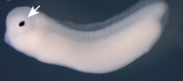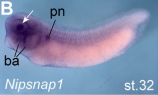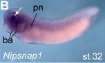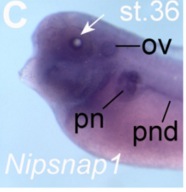 nipsnap1 ((nipsnap homolog 1)) gene expression in Xenopus laevis embryo, assayed via in situ hybridization, NF stage 32, lateral view, anterior left, dorsal up. |