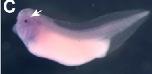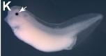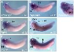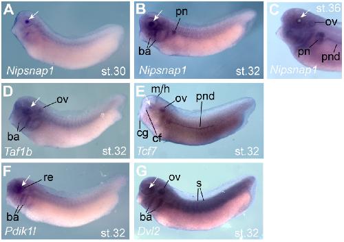 Figure 6. Expression of selected transdifferentiation genes during development. In situ hybridisation of five regeneration associated genes (RAG). Dark blue staining marks expression, and a white arrow indicates the position of the lens. A) Nipsnap1 expression appears in lens cells at stage 30 (A) and is also found in the pronephros (pn) and branchial arches (ba) from stage 32 (B). At stage 36, Nipsnap1 expression is seen in the pronephros and pronephritic duct (pnd) and otic vesicle (ov) as well as in the periphery of the lens (C). D) Tbp1b is expressed predominantly in lens, otic vesicle and branchial arches at stage 32. E) Tcf7 is expressed in lens and choroid fissure of the retina (cf), the midbrain-hindbrain junction (m/h), cement gland (cg), otic vesicle and pronephritic duct at at stage 32. F) Pdik1l is expressed in the developing lens and retina (re) and branchial arches at stage 32. G) Dvl2 is expressed in eye tissues but is not specific, with expression extending throughout the embryo including the somites (s), otic vesicle and branchial arches. Embryos are oriented with anterior to the left and dorsal uppermost. |