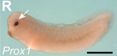 prox1 (prospero homeobox 1) gene expression in Xenopus laevis embryo, assayed via in situ hybridization, NF stage 28/29, lateral view, anterior left, dorsal up. |