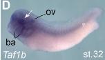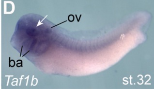 taf1b (TATA-box binding protein associated factor, RNA polymerase I, B) gene expression in Xenopus laevis embryo, assayed via in situ hybridization, NF stage 32, lateral view, anterior left, dorsal up. |