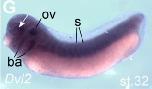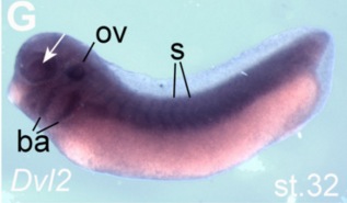 dvl2 (dishevelled segment polarity protein 2) gene expression in Xenopus laevis embryo, assayed via in situ hybridization, NF stage 32, lateral view, anterior left, dorsal up. |