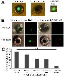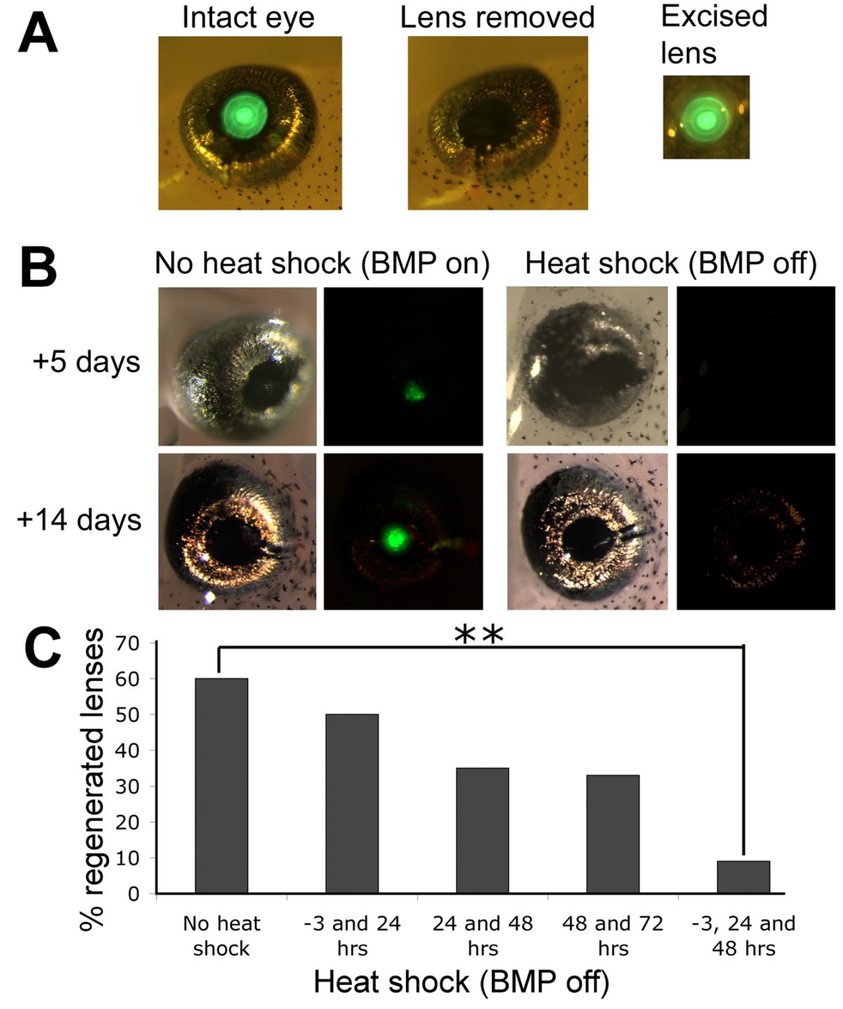 Figure 1. BMP signalling is required for lens regeneration. A) Lentectomy of N1 transgenic tadpoles at stage 50. These tadpoles carry the Hsp70:Noggin; γ-Crystallin:GFP transgene and express GFP in the central lens cells, but not the outermost lens epithelial cells. Removal of the lens can be visualised by the lack of GFP in the lentectomised eye. B) Heat shock initiates expression of the BMP inhibitor noggin, attenuating BMP signalling. In around 60-70% of non heat shocked, lentectomised eyes, regeneration of the lens from the overlying cornea occurs and GFP can be seen after 3-5 days and a new lens is formed after 14 days. When the tadpoles are subjected to heat shock, no GFP is expressed and no lens regenerated. Bright field views are to the left with corresponding fluorescent views adjacent. C) Graph showing the effect of heat shock activation of Noggin on lens regeneration as determined by the presence of any detectable GFP in the eye 10 days after lentectomy. ** indicates p < 0.001. (Chi squared analysis). |