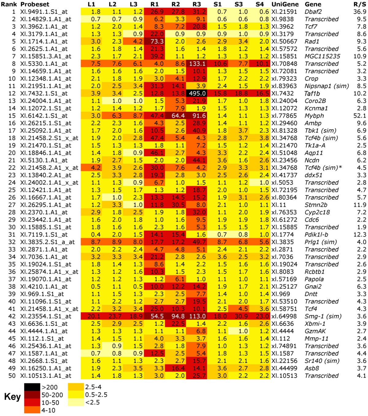 Figure 3. Identification of genes that mimic expression of crystallins during CLT. A) Strategy for identifying CLT specific genes by microarray. Lenses were removed from stage 50 tadpoles and used for RNA extraction of samples L1-3 (differentiated lens). The tadpoles that had undergone lentectomy were allowed to recover for three days before harvesting the cornea for samples R1-3 (regenerating). Finally, a second set of tadpoles were subjected to mock surgery, the cornea was cut, lifted and replaced as for lentectomy but the inner cornea and lens were left in situ. After 3 days corneas were recovered from these animals, generating samples S1, 3 and 4 (sham operated). B) Heatmap of Affymetrix array data showing that the pattern of crystallin expression varies among replicate R samples, with R2 consistently lower. An average expression was used to search for similar patterns in the data. C) Heatmap of top 50 significant matches to the crystallin pattern, excluding the crystallin genes used to generate the pattern average. R/S is the ratio of transcript expression in R1-3 vs. S1, 3 and 4 levels. Bold type in C indicates R > 1.5 S. |