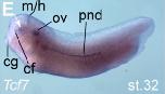 tcf7 (transcription factor 7 (T-cell specific, HMG-box) gene expression in Xenopus laevis embryo, assayed via in situ hybridization, NF stage 32, lateral view, anterior left, dorsal up. |