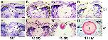 Figure 2. Histology of WT and BMP inhibited (N1) tadpole eyes following lentectomy. (A-D) Representative histological sections through the eyes of transgenic N1 tadpoles 1, 3, 5 and 7 days after lentectomy. Inset in A shows arrows pointing to columnar corneal cells (E-H) Representative sections of wild type eyes at 1, 3, 5 and 7 days after lentectomy. Inset in E indicates columnar corneal cells (arrows). Arrowheads in F indicate the forming lentoid moving into the vitreous. Both transgenic and wild type eyes were subjected to heat shock at -3, 24 and 48 hours relative to lentectomy. Abbreviations: c, cornea; h, hypertrophic cells; i, iris (pigmented epithelium); l, lens; r, retina; v, vitreous. Scale bars in D and H corresponds to 50 μm and applies to all panels. Inset scale bar in A and E corresponds to 10 μm. |