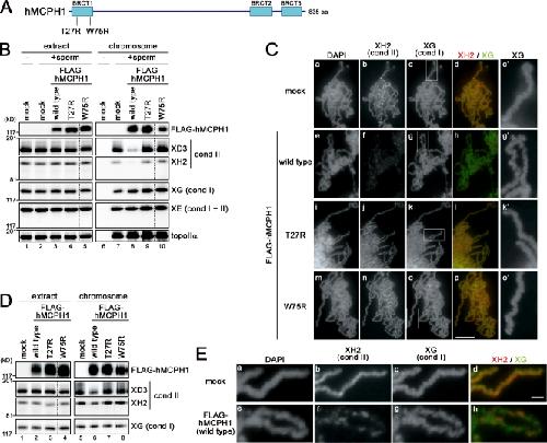 Figure 1. hMCPH1 inhibits chromosomal binding of condensin II in Xenopus egg extracts. (A) hMCPH1 possesses three BRCT domains (blue boxes). Also shown are two point mutations (T27R and W75R) that cause primary microcephaly in MCPH1 patients. (B) A reticulocyte lysate containing no hMCPH1 (mock) or FLAG-tagged hMCPH1 was mixed with 10 vol metaphase egg extracts and incubated for 30 min. Sperm chromatin was then added and incubated for another 120 min. Chromosome fractions were isolated and analyzed by immunoblotting with the antibodies indicated. Aliquots of the extracts were saved before chromosome isolation and analyzed in parallel. No sperm was added in lanes 1 and 6. (C) Metaphase chromosomes were assembled as described in B, fixed, and stained with DAPI, anti–XCAP-H2 (XH2), and anti–XCAP-G (XG). Close-ups of chromosomal regions indicated by the white rectangles in c, g, k, and o are shown in c′, g′, k′, and o′, respectively. Bar, 5 µm. (D) Sperm chromatin was incubated with Xenopus egg extracts for 120 min to assemble metaphase chromosomes. 0.1 vol reticulocyte lysates containing no hMCPH1 (mock) or FLAG-tagged hMCPH1 was then added and incubated for another 60 min. Chromosome fractions were isolated and analyzed as described in B. (E) Metaphase chromosomes were assembled as described in D and analyzed as in C. Bar, 1 µm. The dotted lines indicate where intervening lanes were removed for presentation purposes. cond, condensin; topoIIα, topoisomerase IIα. |