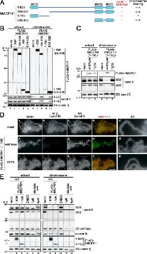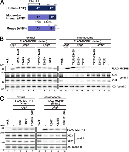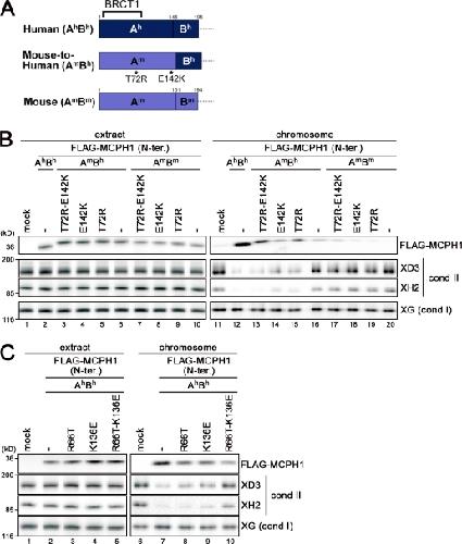 Figure 5. mMCPH1 can be converted into a humanlike, competent form by specific amino acid substitutions. (A) Schematic representation of the constructs used in B. The N-terminal domain of hMCPH1 was divided into two subdomains, Ah (amino acids 1â145) and Bh (amino acids 146â195), and the corresponding domain of mMCPH1 was divided into Am (amino acids 1â151) and Bm (amino acids 152â194), accordingly. A chimera form (AmBh) was created, and single or double point mutations (T72R and E142K) were further introduced in an attempt to confer a humanlike activity on the mouse sequence (mouse to human). (B) Mouse to human conversion. The constructs shown in A were subjected to the cell-free assay. (C) Human to mouse conversion. Two point mutations (R66T and K136E) were introduced singly or doubly into the human sequence, and the resulting constructs were subjected to the cell-free assay. cond, condensin; N-ter., N-terminal; XG, XCAP-G; XH2, XCAP-H2. |