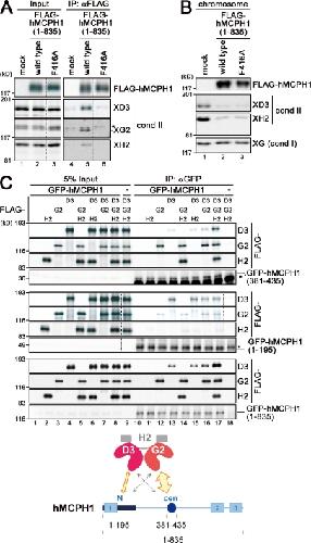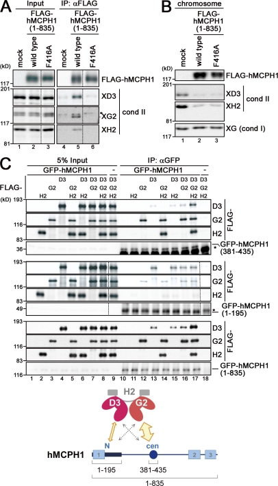 Figure 6. hMCPH1 physically interacts with condensin II through its N-terminal and central domains. (A) A reticulocyte lysate containing no hMCPH1 (mock) or FLAG-tagged hMCPH1 was mixed with 10 vol metaphase egg extracts and incubated for 60 min. Anti-FLAG beads were then added into the mixtures, and bound fractions and aliquots of the mixtures were analyzed by immunoblotting. Different levels of contrast adjustment were performed between the input and immunoprecipitation (IP) blots. The FLAG data are derived from a different membrane than the condensin (cond) II data. Nonspecific bands that cross reacted with anti–XCAP-G2 (XG2) are indicated by the asterisk. (B) Sperm chromatin was incubated with the mixtures as described in A for 120 min, and chromosome fractions were isolated and analyzed by immunoblotting. (C) FLAG-tagged non-SMC subunits of human condensin II (CAP-D3, -G2, and -H2) were translated individually in reticulocyte lysates and mixed in different combinations as indicated. Three different versions of GFP-tagged hMCPH1 were produced in different reactions, incubated with the aforementioned mixtures, and subjected to immunoprecipitation with anti-GFP. The immunoprecipitates and 5% of input fractions were analyzed by immunoblotting with anti-FLAG and anti-GFP. FLAG data are derived from a different membrane than the GFP data for the top and middle datasets. The asterisks indicate nonspecific bands. The major binding partners of the central (cen; amino acids 381–435) and N-terminal (N; amino acids 1–195) domains of hMCPH1 are CAP-G2 and -D3, respectively (cartoon). The dotted lines indicate where intervening lanes were removed for presentation purposes. XH2, XCAP-H2. |