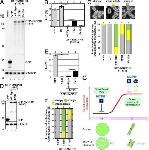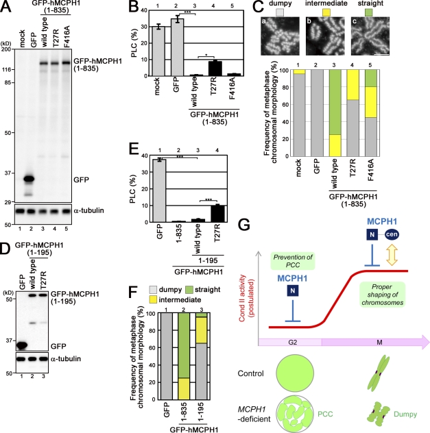 Figure 7. The N-terminal domain of hMCPH1 is sufficient to rescue the PCC phenotype, whereas its central domain is additionally required for shaping metaphase chromosomes in patient cells. (A) MCPH1 patient cells were transduced with GFP-tagged full-length hMCPH1 by means of a lentivirus expression system. Mock-transduced cells and cells transduced with GFP alone were used as negative controls. Lysates were prepared from these cells and analyzed by immunoblotting with the indicated antibodies. (B) The cells described in A were fixed and stained with DAPI. The percentages of prophaselike cells (PLCs) in such populations were scored and plotted (*, P < 0.05; ***, P < 0.001 between each pair; PLCs were scored from three independently prepared coverslips [n = 3]). Representative examples of nuclear morphology in cells expressing GFP alone or GFP-hMCPH1 (wild type) are shown in Fig. S5 (A and B). By definition, the PLCs include not only G2 cells displaying PCC but also early G1 cells displaying delayed chromosome decondensation (Trimborn et al., 2006). In the current study, we follow this definition for the analysis of PLCs. However, when the percentages of the PLCs in patient cells were lowered to the basal level, we describe it as a “PCC rescue” for simplicity. (C) Chromosome spreads were prepared from the cells described in A and stained with DAPI and anti-Smc2. The morphology of chromosomes from 20 spreads was classified into three categories, and each sample was scored accordingly. (a) “Dumpy” is a category of short chromosomes with wavy axes that are commonly observed in the MCPH1 patient cells. (c) “Straight” is a category of long chromosomes with straight axes that are routinely observed in nonpatient cells. (b) “Intermediate” is a category belonging between dumpy and straight. Representative images of each category (stained with anti-Smc2) are shown at the top. Representative data from two independent experiments are shown. Bar, 5 µm. (D) MCPH1 patient cells were transduced with GFP alone or the GFP-tagged N-terminal domain of hMCPH1. Lysates were prepared from these cells and analyzed by immunoblotting as described in A. (E and F) The percentages of PLCs and the morphology of chromosome spreads were scored as described in B and C, respectively. For F, representative data from two independent experiments are shown. (G) A postulated change of condensin (Cond) II activity is shown by the red line. To prevent PCC in G2 phase, the N-terminal (N) domain of MCPH1 is sufficient. To properly shape metaphase chromosomes, both the N-terminal and central (cen) domains are required. Error bars indicate means ± SD. |