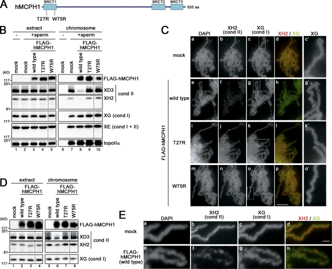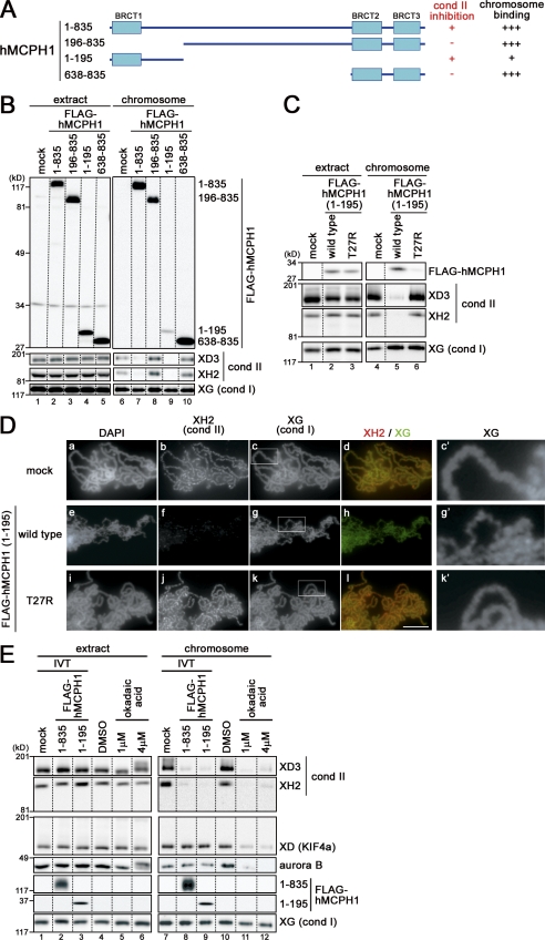 Figure 2. An N-terminal domain of hMCPH1 is sufficient to specifically inhibit chromosomal loading of condensin II in Xenopus egg extracts. (A) Deletion constructs of hMCPH1 used in this paper. (B) Full-length hMCPH1 and three different deletion constructs were subjected to the cell-free assay. Chromosome fractions and aliquots of the extracts were analyzed by immunoblotting. (C) The same experiment as in B was repeated using the wild-type and mutant (T27R) forms of the N-terminal domain (amino acids 1–195). (D) Metaphase chromosomes were assembled in an extract supplemented with the wild-type and mutant (T27R) forms of the N-terminal domain (amino acids 1–195) as described in B, fixed, and stained with DAPI, anti–XCAP-H2 (XH2), and anti–XCAP-G (XG). Close-ups of chromosomal regions indicated by the white rectangles in c, g, and k are shown in c′, g′, and k′, respectively. Bar, 5 µm. (E) Metaphase egg extracts were mixed with 0.1 vol reticulocyte lysates containing FLAG-hMCPH1 (amino acids 1–835 [full length] or 1–195) or treated with 1 or 4 µM okadaic acid. Sperm chromatin was added and incubated for 120 min to assemble metaphase chromosomes. Chromosome fractions were then isolated and analyzed as described in B. The dotted lines indicate where intervening lanes were removed for presentation purposes. cond, condensin. |