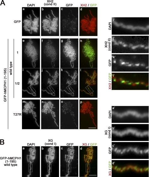 Figure 3. The N-terminal domain of hMCPH1 competes for chromosome binding of condensin II in Xenopus egg extracts. (A) A reticulocyte lysate containing GFP or GFP-hMCPH1 (amino acids 1–195; wild type and T27R) was mixed with 10 vol metaphase egg extracts and incubated for 30 min. Sperm chromatin was then added and incubated for another 120 min. Metaphase chromosomes assembled were fixed and stained with DAPI (a, e, i, and m), anti–XCAP-H2 (XH2; b, f, j, and n), and anti-GFP (GFP; c, g, k, and o). To reduce the dose of GFP-hMCPH1 (amino acids 1–195) to 50% (i–l), the reticulocyte lysate containing the wild-type protein was diluted twofold with a mock lysate before being mixed with the egg extracts. Close-ups of chromosomal regions indicated by the white rectangles in i–l are shown in i′–l′. (B) Metaphase chromosomes assembled in the presence of GFP-hMCPH1 (amino acids 1–195; wild type) as described in A were fixed and stained with DAPI (a), anti–XCAP-G (XG; b), and anti-GFP (GFP; c). Close-ups of chromosomal regions indicated by the white rectangles in a–d are shown in a′–d′. Bars, 5 µm. cond, condensin. |