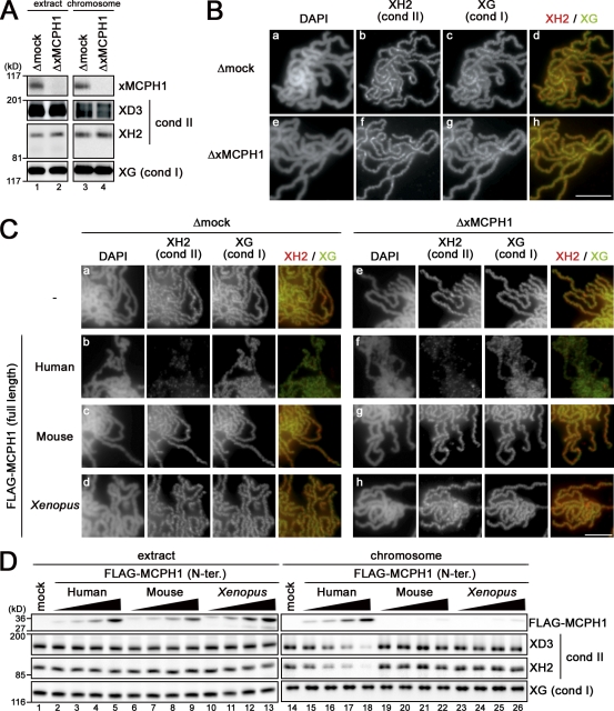 Figure 4. Characterization of xMCPH1 and mMCPH1 in the cell-free assay. (A) Sperm chromatin was added to metaphase egg extracts that had been depleted with control IgG (Δmock; lanes 1 and 3) or anti-xMCPH1 (ΔxMCPH1; lanes 2 and 4). After incubation for 120 min, chromosomes were isolated, and their associated polypeptides (lanes 3 and 4) and aliquots of the extracts (lanes 1 and 2) were analyzed by immunoblotting using the antibodies indicated. (B) Metaphase chromosomes were assembled in the mock-depleted (Δmock; a–d) or xMCPH1-depleted (ΔxMCPH1; e–h) extracts, fixed, and double stained with anti–XCAP-H2 (XH2) and anti–XCAP-G (XG). Bulk chromosomal DNA was counterstained with DAPI. (C) A reticulocyte lysate containing no hMCPH1 (−) or FLAG-tagged full-length MCPH1 from human, mouse, and Xenopus was mixed with 10 vol metaphase egg extracts that had been depleted with control IgG (Δmock; rows a–d) or anti-xMCPH1 (ΔxMCPH1; rows e–h) and incubated for 30 min. Sperm chromatin was then added and incubated for another 120 min. The resulting metaphase chromosomes were analyzed as in B. (D) Increasing concentrations of the N-terminal (N-ter.) domains of human, mouse, and Xenopus MCPH1 were mixed with metaphase egg extracts (lanes 1–13) and tested for their ability to inhibit chromosomal loading of condensin (cond) II. The relative concentrations of MCPH1 added were 1:8 (lanes 2, 6, and 10), 1:4 (lanes 3, 7, and 11), 1:2 (lanes 4, 8, and 12), and 1 (lanes 5, 9, and 13); the highest concentration roughly corresponded to the standard one used in other experiments. Sperm chromatin was incubated with these extracts, and chromosome-bound fractions (lanes 14–26) were isolated and analyzed by immunoblotting. Bars, 5 µm. |