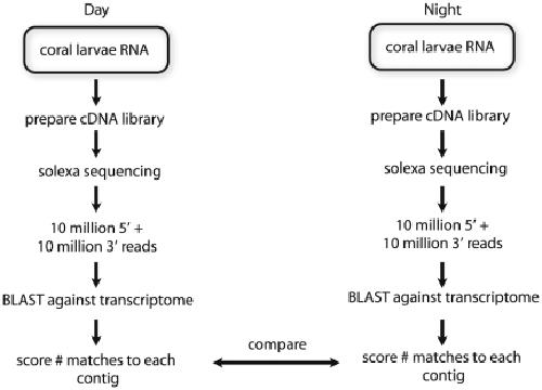 Figure 1. Solexa sequencing data processing pipeline.Detailed steps involved in Solexa deep sequencing of coral larvae samples for both day and night (12 hour difference). Preparation of cDNA library, sequencing and generation of output were performed by the BC Genome Sciences Centre, while all other components were performed by authors.