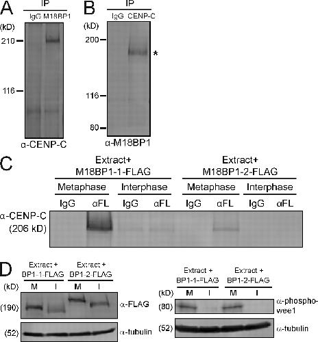 Figure 7. CENP-C associates with M18BP1-1 in metaphase extract. (A) M18BP1 coprecipitates CENP-C from Xenopus egg extract. Western blot for CENP-C after immunoprecipitation (IP) of metaphase Xenopus extract with IgG or α-M18BP1. (B) CENP-C coprecipitates M18BP1 from the Xenopus egg extract. Western blot for M18BP1 after immunoprecipitation of metaphase Xenopus extract with IgG or αâCENP-C. We only detected a single M18BP1 isoform (asterisk) coprecipitating with CENP-C, which migrates at the molecular mass of isoform 1. (C) M18BP1-1 associates with CENP-C in metaphase extract. FLAG epitopeâtagged M18BP1 IVT proteins were added to metaphase or interphase extracts, reactions were split in half, and M18BP1-FLAG proteins were immunoprecipitated with control (IgG) or α-FLAG (αFL) antibodies. A Western blot of the immunoprecipitates for CENP-C is shown. (D) Representative Western blots from immunoprecipitation experiments described in C. Samples were taken after incubation of M18BP1-FLAG proteins in extract. (left) α-FLAG Western blot; (right) phospho-wee1 Western blot to assess the cell cycle state of the extract. M and I indicate metaphase and interphase extract, respectively. The molecular masses of protein standards and individual proteins in kilodaltons are listed on the left of each blot. |
