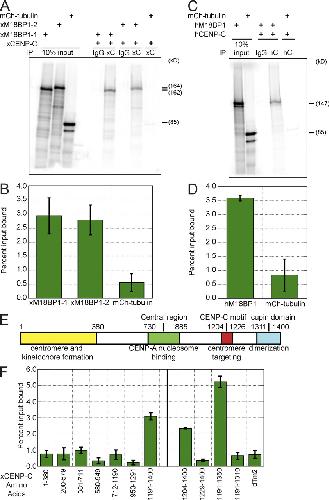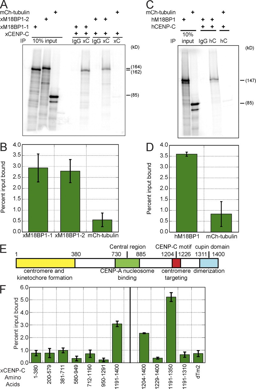 Figure 8. CENP-C directly interacts with M18BP1 through two conserved domains in CENP-C. (A) xCENP-C binds directly to both isoforms of xM18BP1. A representative gel from an xCENP-CâxM18BP1 in vitro binding assay is shown. [35S]methionine-labeled in vitro translated xM18BP1-1 or xM18BP1-2 was mixed with unlabeled in vitro translated xCENP-C and immunoprecipitated with control (IgG) or αâxCENP-C antibodies. Samples were run on an SDS-PAGE gel, and bound xM18BP1 protein was detected by autoradiography. mCherry (mCh)-tubulin was used as a negative control. The addition of each component is shown at the top of the gel. (B) Quantification of the CENP-CâM18BP1 in vitro binding assay represented in A. (C) hCENP-C (hC) binds directly to hM18BP1. Representative gel from an hCENP-CâhM18BP1 in vitro binding assay. [35S]methionine-labeled in vitro translated hM18BP1 was mixed with unlabeled in vitro translated hCENP-C and immunoprecipitated with IgG or αâhCENP-C antibodies. Samples were run on an SDS-PAGE gel, and bound hM18BP1 protein was detected by autoradiography. mCherry-tubulin was used as a negative control. (D) Quantification of hCENP-CâhM18BP1 in vitro binding assay represented in C. (E) Schematic of CENP-C domains. (F) M18BP1 binding to CENP-C requires the CENP-C motif (amino acids 1,204â1,226) and the N-terminal half of the cupin domain (amino acids 1,311â1,397). In vitro binding assays with CENP-C fragments were performed as described in A. Domain mapping of the entire protein is shown to the left of the black vertical line, and fine-scale mapping of the C terminus is shown to the right. Error bars show SEM; n = 3. IP, immunoprecipitation. |