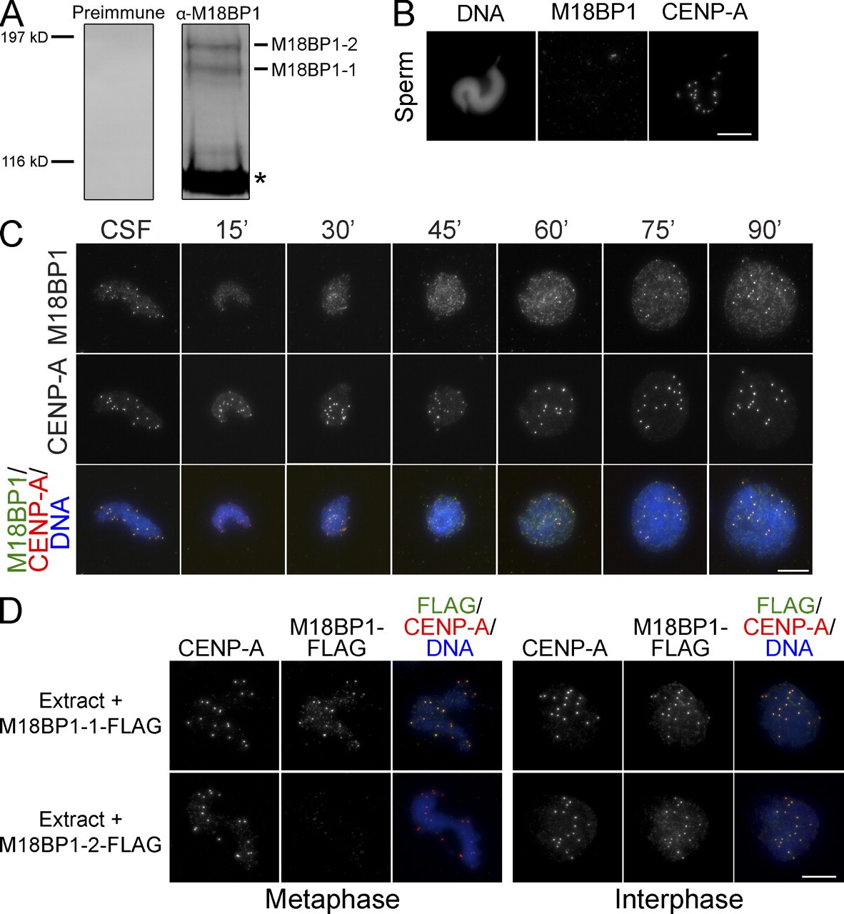 Figure 2. Characterization of Xenopus M18BP1. (A) Western blot of Xenopus egg extract with preimmune sera (Preimmune) or affinity-purified rabbit antibody raised against Xenopus M18BP1 (α-M18BP1). α-M18BP1 recognizes both isoforms of xM18BP1, and both isoforms of xM18BP1 are present in egg extract. The asterisk denotes a cross reacting band. (B) M18BP1 is not present on Xenopus sperm chromatin. After decondensation with Xenopus Nap1, Xenopus sperm chromatin shows staining for CENP-A but not M18BP1. (C) Time course of M18BP1 localization in the Xenopus egg extract. Xenopus sperm chromatin was incubated in metaphase extract for 30 min, and sperm chromatin was stained for M18BP1 at various time points after release from metaphase arrest. Time (minutes) after release from metaphase is indicated above each image column. M18BP1, CENP-A, or merged M18BP1, CENP-A, and DNA staining are indicated on the left. (D) M18BP1-1 assembles at sperm centromeres in metaphase extract, and both M18BP1 isoforms assemble at sperm centromeres in interphase extract. Metaphase extracts are shown on the left, and interphase extracts are shown on the right. The FLAG epitopeâtagged M18BP1 isoform that was added to the extract is indicated on the left. Immunostaining is shown above the images. Bars, 10 µm. |