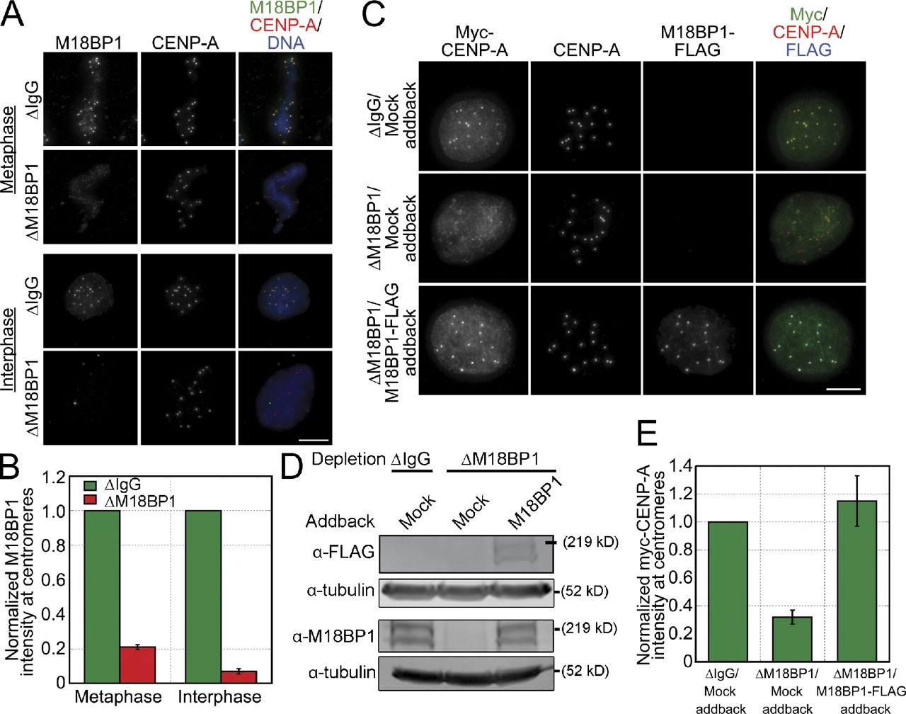 Figure 3. Depletion of M18BP1 inhibits xHJURP-mediated CENP-A assembly in extract. (A) M18BP1 depletion from egg extract inhibits M18BP1 localization to centromeres. Xenopus sperm chromatin was incubated in mock- or M18BP1-depleted metaphase and interphase extracts and stained for M18BP1 and CENP-A. The depletion condition and cell cycle stage are listed to the left of the images, and the localized proteins are indicated above the images. (B) Quantification of M18BP1 fluorescence intensity at centromeres (normalized to the levels in mock-depleted extracts) after M18BP1 depletion. Quantification was performed as described in Fig. 1. Error bars show SEM; n = 3. (C) M18BP1 is required for CENP-A assembly in Xenopus extract. Representative images from CENP-A assembly assays performed using either mock- or M18BP1-depleted extracts that were supplemented with mock or M18BP1-FLAG IVT proteins. The depletion and addback conditions are listed to the left of each image row, and the immunolocalized proteins are listed above. (D) Representative Western blots of extracts from CENP-A assembly assays described in C. The top blots show the levels of the FLAG-tagged M18BP1 isoforms added back to the extract. The bottom blots show the total M18BP1 levels in the extract. Tubulin was used as a loading control. (E) Quantification of mycâCENP-A fluorescence intensity at centromeres for CENP-A assembly reactions described in C, which were normalized to the levels in mock-depleted extracts. Quantification was performed as described in Fig. 1. Error bars show SEM; n = 3. Bars, 10 µm. |