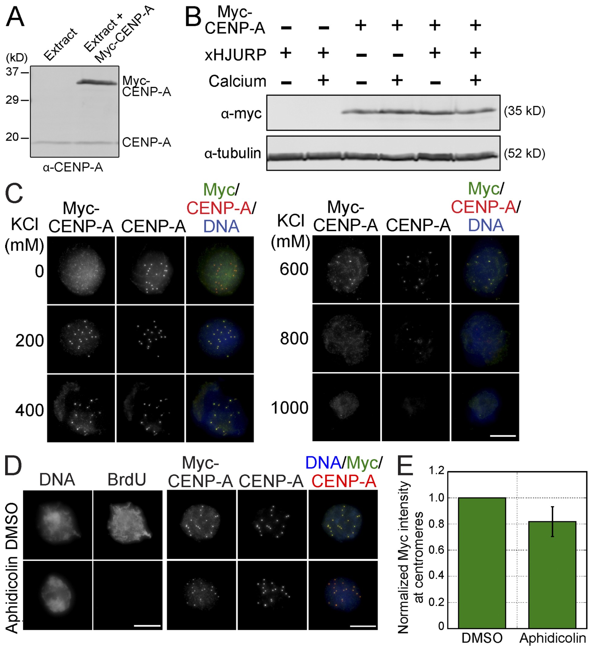 Figure S1. Characterization of xHJURP-mediated CENP-A assembly assay in Xenopus egg extract. (A) Representative Western blot from a CENP-A assembly assay showing relative levels of mycENP-A and endogenous CENP-A in bulk extract. The ratio of mycENP-A to CENP-A in this experiment was 4.4; the mean ratio across all experiments was 5. (B) Representative Western blot from a CENP-A assembly assay. MycENP-A, xHJURP, or calcium addition is shown above each lane. (top) Anti-myc blot, which shows that mycENP-A protein levels in bulk extract were the same in all samples supplemented with mycENP-A RNA. Tubulin is shown as a loading control. (C) MycENP-A is stably incorporated into sperm centromeric chromatin. Representative images from CENP-A assembly reactions were subjected to salt extraction before fixation. The concentration of KCl used for salt extraction is shown to the left of the images, and immunolocalized proteins are indicated above. n = 3. (D) Representative images from a CENP-A assembly assay performed in the presence of aphidicolin, a small molecular inhibitor of DNA polymerase. DMSO or aphidicolin addition is listed to the left of the images, and immunolocalized antigens are indicated above. Aphidicolin treatment prevented BrdU incorporated into chromatin, indicating that DNA replication has been blocked. (E) Quantification of mycENP-A fluorescence intensity at centromeres in the CENP-A assembly reactions described in D, which were normalized to levels in the DMSO-treated sample. Error bars show SEM; n = 4. Bars, 10 μm. |