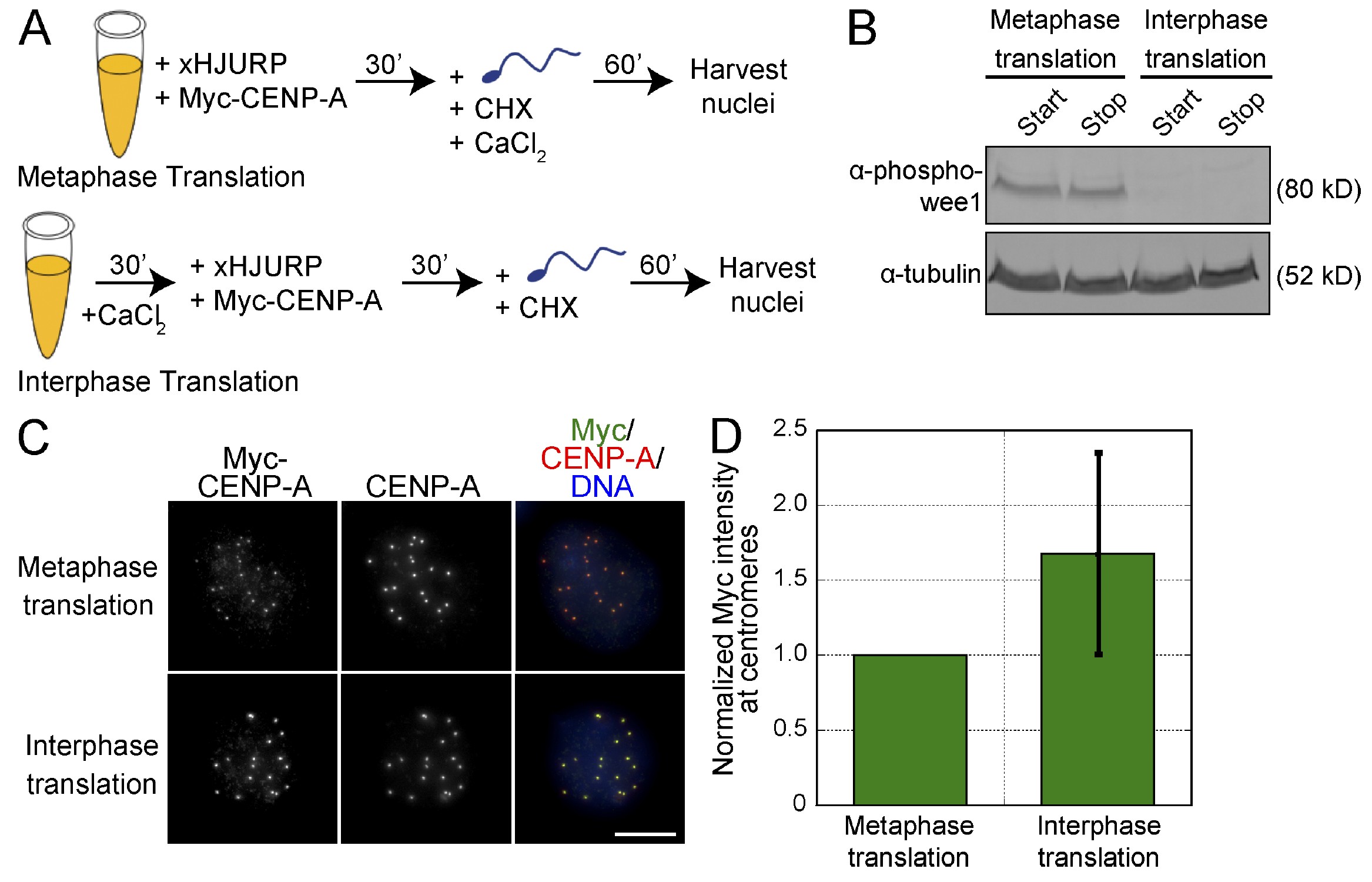 Figure S4. xHJURP, mycENP-A, and the sperm chromatin template do not need to pass through mitosis for efficient mycENP-A assembly. (A) Schematic of CENP-A assembly assay comparing the efficiency of assembly after mycENP-A translation in metaphase versus interphase extracts. (B) Representative Western blot from CENP-A assembly assays described in A. Samples were taken at the start and end of the 30-min mycENP-A translation period. Samples were blotted for phospho-wee1, a mitotic marker, to ensure that extracts maintained metaphase arrest throughout translation period (metaphase translation) or that extracts had entered interphase before initiation of translation (interphase translation). Tubulin is shown as a loading control. (C) Representative images from the CENP-A assembly assay described in A. Translation conditions are indicated to the left of the images, and the immunolocalized proteins are listed above. Bar, 10 μm. (D) Quantification of mycENP-A fluorescence intensity at centromeres in CENP-A assembly assays described in A, which were normalized to the metaphase translation sample. Error bars show SEM; n = 3. Downloaded from jcb.rupress.org on December 11, 2012 Published September 12, 2011 |