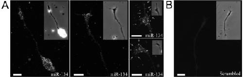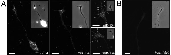Figure 2. Enrichment of miR-134 in Xenopus growth cones. Fluorescence in situ hybridization was used to detect miR-134 in cultured Xenopus spinal neurons using a LNA probe (A) or scrambled probe (B). Phase contrast images of the growth cones are shown as insets. Arrows indicate the miR-134 puncta in the lamellipodia and filopodia. Scale bars: 10 μm.