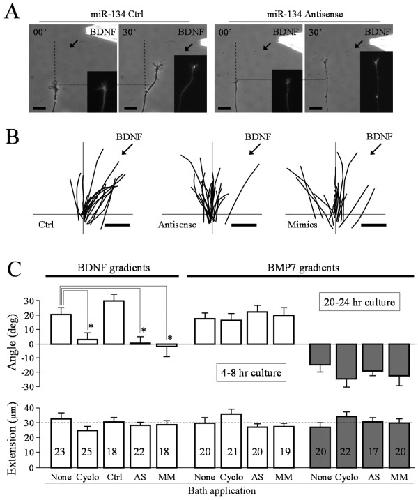 BACKGROUND: The small non-coding microRNAs play an important role in development by regulating protein translation, but their involvement in axon guidance is unknown. Here, we investigated the role of microRNA-134 (miR-134) in chemotropic guidance of nerve growth cones.