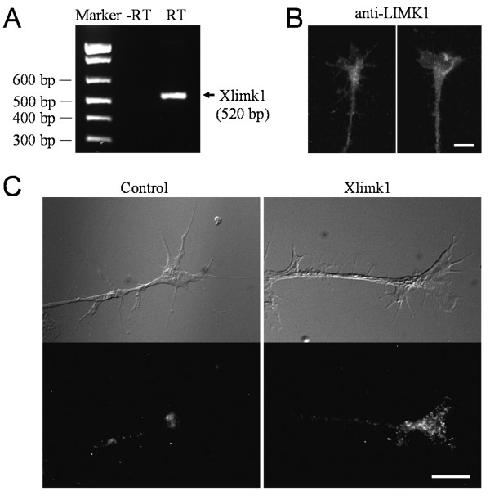Figure 5. Detection of Xenopus limk1 in Xenopus neurons. (A) RT-PCR detection of Xlimk1 mRNA from RNA samples extracted from Stage 20-22 Xenopus neural tube tissues using specific primers. RNA samples were processed without (-RT) and with reverse transcriptase (RT). (B) Representative fluorescence images of cultured Xenopus growth cones labeled using a specific antibody against LIMK1. (C) Detection of Xlimk1 mRNA in Xenopus growth cones by fluorescence in situ hybridization. Top panels are the differential interference contrast (DIC) images of the growth cones. Bottom panels are the FISH images of Xenopus growth cones labeled with digoxigenin-conjugated probes (three probes, ~50 nt each) that are specifically complementary to different parts of the coding region of Xlimk1 mRNA. The reverse probes were used as the control. Scale: 10 μm.