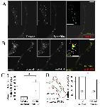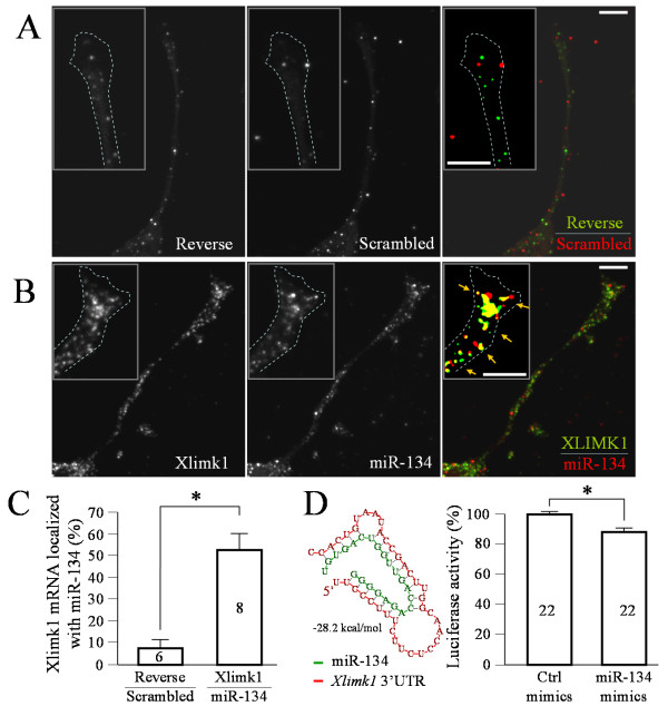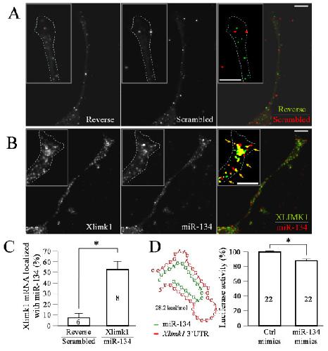 Figure 6. Xenopus limk1 mRNA as a potential target of miR-134. (A-B) Representative confocal double FISH images showing growth cones subjected to either reverse Xlimk1 probes and scrambled miRNA probes (A) or Xlimk1 probes and LNA-miR-134 probes (B). Color panels are the merged channels of both Xlimk1 (green) and miR-134 (red) signals, of which an intensity threshold was applied to each channel to highlight the FISH signals. Yellow colors indicate co-localization of Xlimk1 and miR-134. Scale bars: 10 μm. (C) Quantification of the percentage of Xlimk1 puncta co-localized with miR-134 puncta. Numbers indicate the number of growth cones examined. (D) The predicted duplex formation between miR-134 (red) and Xlimk1 (green) 3'UTR is shown on the left (optimal binding energy: -28.2 kcal/ml). The results of luciferase assays using a Xlimk1 3'UTR-luciferase reporter are shown in the bar graph on the right. Numbers indicate the total numbers of samples from three repeated trials. Error bars depict the standard error of the mean. Asterisks in (C & D): p < 0.01 Student's t-test.