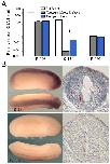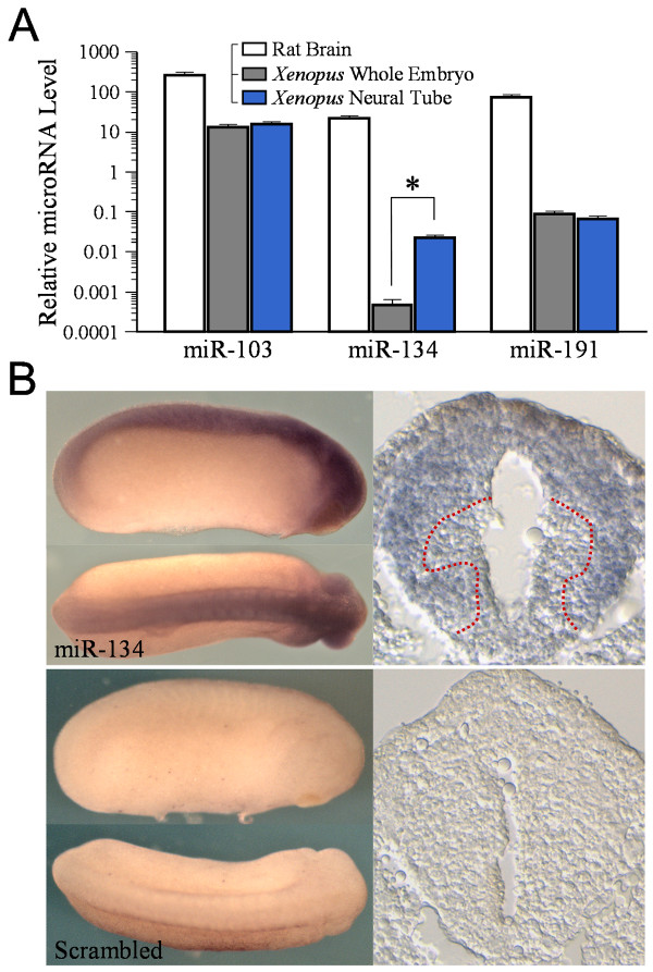 Figure 1. Presence of miR-134 in Xenopus neural tissues. (A) Taqman stem-loop real-time PCR assays on the expression of three miRNAs, miR-103, miR-134, and miR-191 in rat brain, whole Xenopus embryos, and Xenopus neural tube tissues. Please note that both Xenopus samples were total RNAs, whereas the rat brain sample was processed for microRNA enrichment using a mirVana miRNA isolation kit (see Methods). As a result, the microRNA level in the rat brain sample was much higher and merely serves as a positive control. The relative miRNA levels are plotted in logarithmic scale. The error bars represent the standard error of the mean. Asterisk: p < 0.01 Student's t-test. (B) Whole mount in situ analysis of miR-134 expression in Xenopus embryos (stage 24) using a LNA probe against miR-134 or a scrambled probe. Cross sections of the spinal cord are shown on the right side. Dotted red lines depict the boundary of miR-134 positive and negative regions.