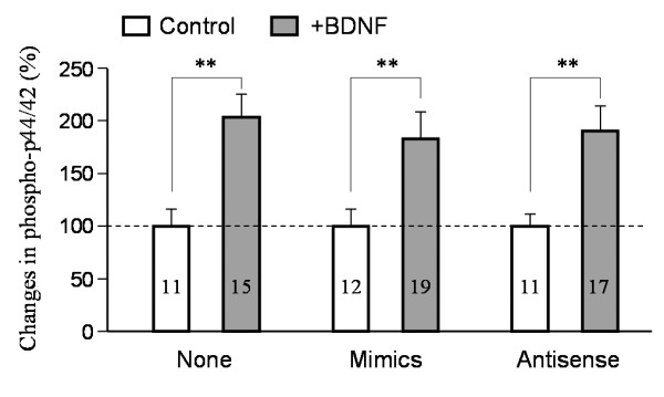 Figure 4. Quantitative analysis of BDNF-induced p44/42 MAPK activation by immunofluorescence of phospho-p44/42 levels in Xenopus growth cones. Neurons injected with control, miR-134 mimics and antisense inhibitors were exposed to control saline or BDNF (50 ng/ml) for 30 min. The immunofluorescence intensity of BDNF-exposed growth cones was normalized to that of the corresponding group without BDNF exposure. Numbers indicate the number of growth cones examined. Error bars: the standard error of the mean. Double asterisks: p < 0.001 (Student's t-test).