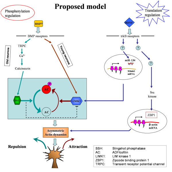 Figure 7. The schematic diagram shows a proposed model on how different cues might act through PS-dependent and -independent pathways to regulate growth cone steering. BMP7 acts as bidirectional guidance molecular through phosphorylation regulation of actin depolymerizing factor (ADF)/cofilin (AC). We propose that BDNF gradients release the inhibition of translation by miR-134 and induce the local translation of Xlimk1 in an asymmetric way, leading to the asymmetric modification of the actin dynamics for growth cone steering. BDNF also acts to elicit asymmetric β-actin translation, which could plausibly operate in parallel to or in concert with the miR-134 regulation of LIMK1 translation for growth cone turning. Future experiments are required to test this model. For simplicity, the mTOR pathway is not depicted in the model.