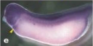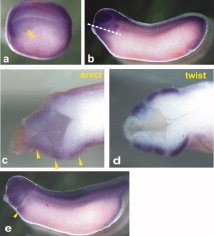Figure 1. Determination of the expression pattern of ARVCF by whole-mount in situ hybridization. X. laevis embryos at different developmental stages were examined using an antisense probe directed against ARVCF. a: Lateral view of stage-18 embryo with dorsal side at the top, anterior to the left. The arrowhead shows enriched transcripts in the neural plate and bordering neural crest. b: Lateral view of a stage-26 tailbud with the anterior towards the left. The line shows the position of the section shown in panel c. c: Horizontal section through the head region of a stage-26 tailbud showing the presence of ARVCF transcripts in the cranial neural crest cells (yellow arrowhead). d: A similar section of a stage-26 embryo stained with the neural crest marker Twist as a reference. e: Stage-31 early tadpole showing enriched ARVCF expression in the head region and the heart (yellow arrowhead).Download figure to PowerPoint