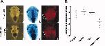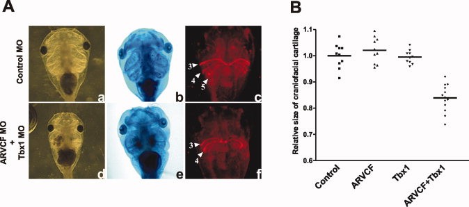 Figure 5. Cooperative effect of the depletion of ARVCF and Tbx1. A: Fifty nanograms of control MO (aâc) or combined subphenotypic doses of ARVCF MO and Tbx1 MO (dâf) were injected at the one-cell stage. Tadpoles are shown alive at stage 48 (a,d), fixed and stained with Alcian Blue to reveal the cartilage structures (b,e), or stained with the von Willebrand factor antibody to reveal the aortic arches (c,f). Simultaneous depletion of ARVCF and Tbx1 results in malformation of cartilage, as seen in a living embryo (d) and after Alcian Blue staining (e), compared with the control embryos (a, b). Depletion of both ARVCF and Tbx1 also results in defects in aortic arch formation and frequent absence of arch 5 (f). B: The cooperative effect was also manifested in the width of the head. Embryos injected with a combination of subphenotypic doses of ARVCF and Tbx1 MO had significantly narrower heads than tadpoles injected with either control, Tbx1, or ARVCF MO (P = 0.0017).Download figure to PowerPoint