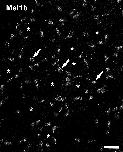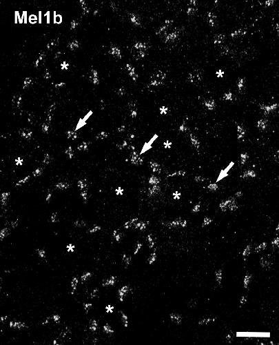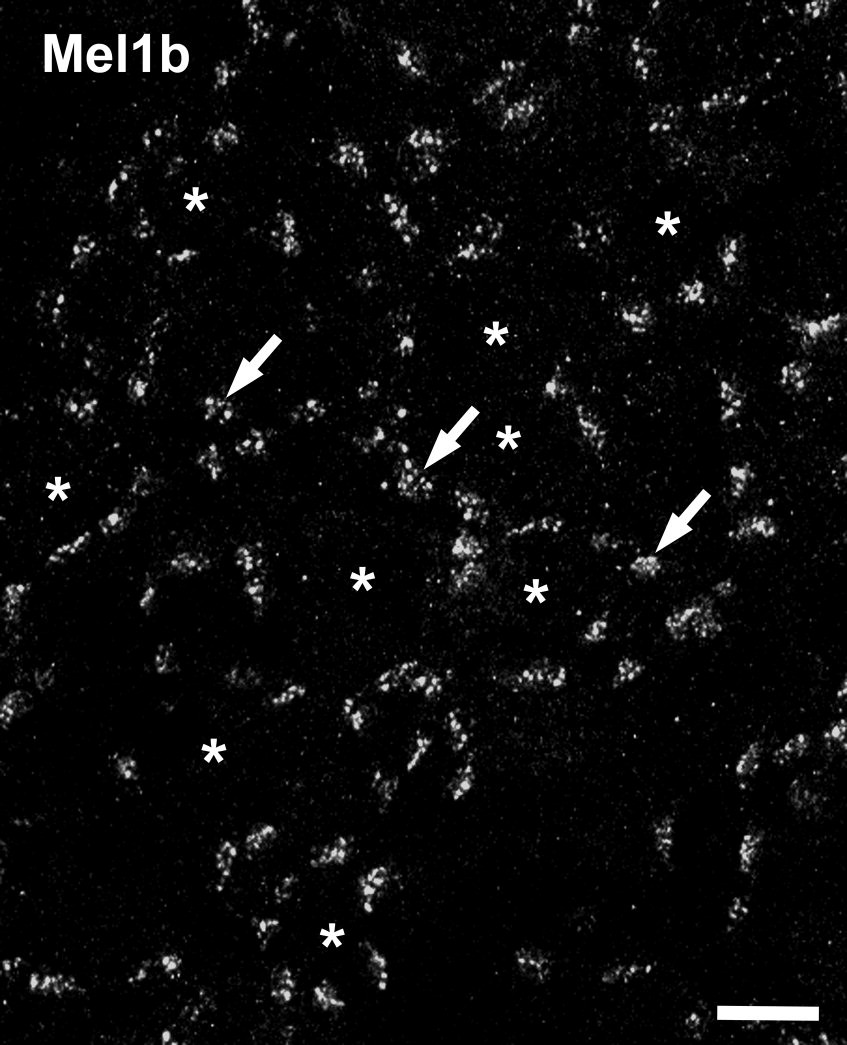 Figure 2. Patchy Mel1b receptor distribution in the OPL resembles the distribution of cone terminals. Mel1b receptor labeling in retinal flatmounts confirms the localization of Mel1b to discrete patches of processes (arrows) in the OPL, reminiscent of cone terminal distribution. The patches of Mel1b receptor labeling tend to form annuli surrounding a center region devoid of Mel1b labeling (*). Confocal image stack comprised of 18 optical slices of â400 nm each. Scale bar = 10 μm.